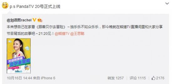 王思聪“熊猫TV”还未上线就已经获得了不少网友的关注,虽然可能大多数网友并没有参与到内测之中,但光看早前曝光的明星阵容,网友已经表示:老公,跟定你了!而日前,王思聪转发刘语熙的微博,并且确认PandaTV将会在20号上线!