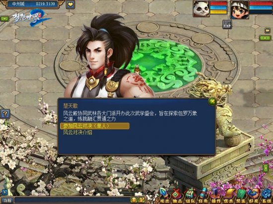 全新活动“风云对决”,华山论剑比高低。人物等级≥30级的玩家,皆可在中州城(217,135)的楚天歌处单人报名参加“风云对决”活动。风云殿协同武林各大门派开办此次武学盛会,旨在探索包罗万象之道,练就融会贯通之力。进入风云殿后,玩家会被随机分配到两个阵营战斗,所有玩家的起始属性和招式都是统一的,需要在活动中通过战斗等方式来提升自己的属性、获得新的招式。