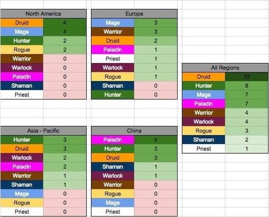 北美选手:4德鲁伊,4法师,2猎人,2盗贼