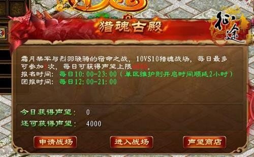 前不久推出的“猎魂古殿”战场,因PK刺激、奖励丰厚受到玩家普遍喜爱。无数玩家为了每日能够获得4000点声望,在古殿内展开一场又一场冰与火之间的较量。