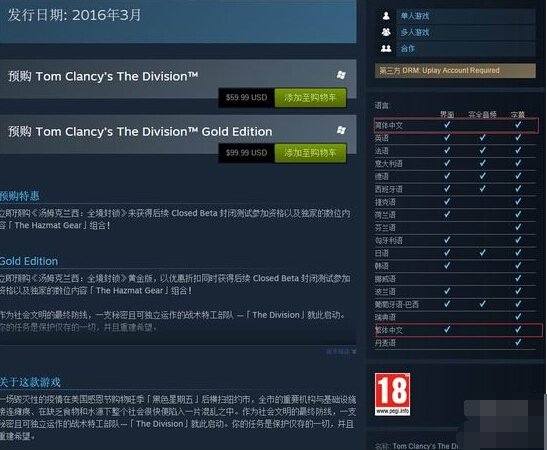 目前《全境封锁》在Steam平台开放了游戏预购,标准版售价59.99美元,典藏版99.99美元。在Steam页面中我们可以发现,本作支持简体中文和繁体中文,想要入正的玩家可以考虑一下。