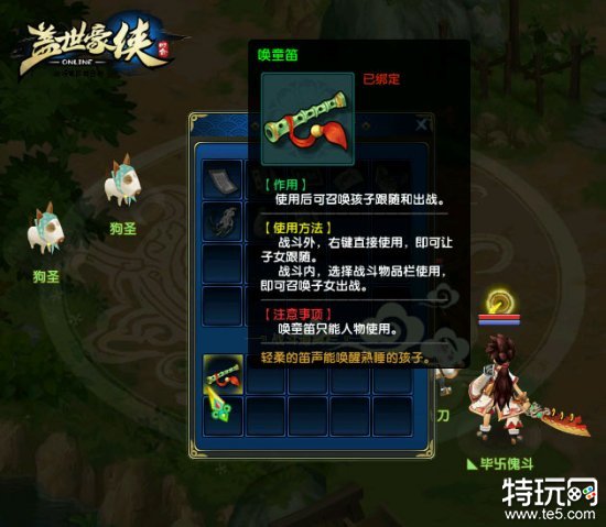 子女从至交名人身上习得神功,便可以与大侠一同出战。唤童笛是呼唤子女到身边的道具。子女诞生时你便可以拥有它。当父母想念子女,在战斗外吹响唤童笛,就可以将子女呼唤到面前与他们嬉戏玩乐。将唤童笛放入战斗背包栏后,就可以在战斗的时候呼唤子女上阵助战。只要进入战斗界面使用唤童笛可召唤子女进入战场,与大侠齐齐上阵杀敌。