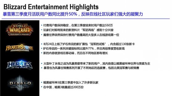 今日动视暴雪公布了2015年第三季度的财报。在暴雪游戏方面,暴雪对第三季度的点评是月活跃用户数同比提升50%,反映出在线社区玩家们的强大凝聚力。在各游戏中,魔兽世界表现稳定,付费用户数在第三季度结束时达550万,同时在8月公布了最新的资料片军团再临;炉石传说表现抢眼,新扩展包不仅让游戏持续增长,而且第三季度创造了季度营收的新纪录;暗黑3继续增长新用户,并且国服发售突破200万;守望先锋受到强烈关注,开启封测后除中国地区外有700万玩家参与注册。