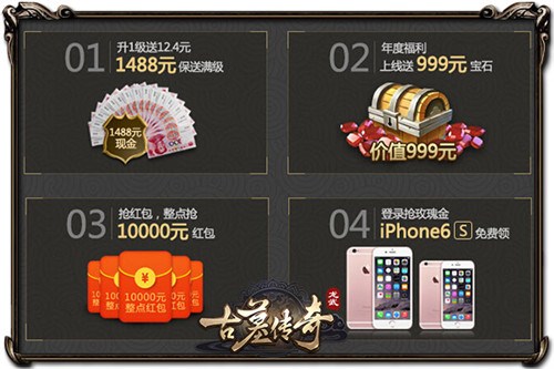 狂欢活动火爆来袭,只有你想不到,没有龙武做不到!《龙武》准备800万超值豪礼,回馈新老玩家!进入新服,升1级送12.4元,1488元保送满级;年度福利回馈,上线即送999元宝石礼包。除了现金、宝石赠送,官方还准备海量红包同庆新版上线,在线整点摇10000元红包,嗨翻新服。对了,玫瑰金iPhone 6S也加入登录豪礼中,不要忘了领取!