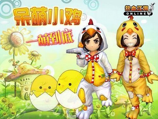 “呆萌小鸡”披风分为男女不同款式,采用了现下颇为流行的连体服样式,小鸡造型兜帽、小鸡爪子的手脚套,玩家从头到脚无一不展现出浓浓的萌属性。男款披风主色调为白色,并有胸前和腿部的大片亮黄色起撞色效果;女款披风则和男款披风在色调上相反,主色调为亮黄色,并采用白色作为撞色配色。呆萌小鸡披风除了整体造型仿佛刚出身的小鸡,还使用了红底白点的波点蝴蝶结和手腕脚腕的装饰点缀,萌中带着时尚,潮流中带着可爱。