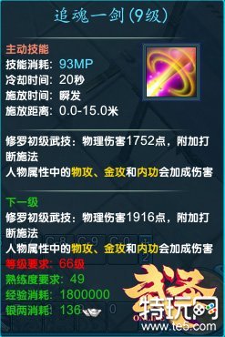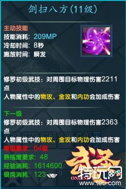 剑扫八方和追魂一剑是伤害最高的两大技能,前者具有群体伤害,无需选中目标,CD8秒,后者是单体高爆发技能并具有长距离冲刺和打断效果,CD20秒。