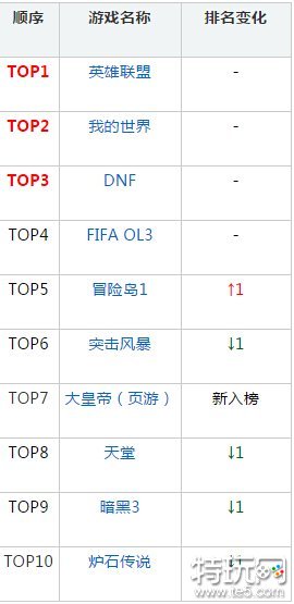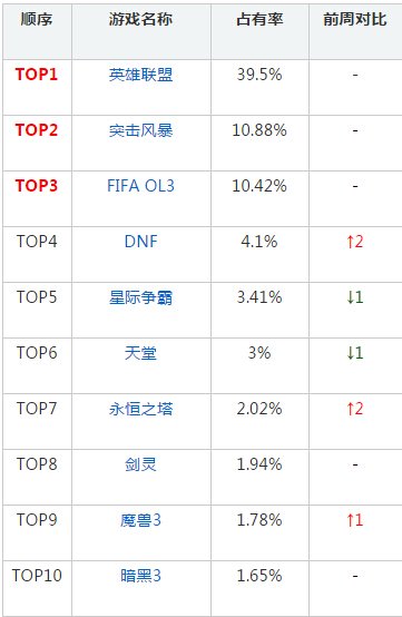 本周,LOL已经连续174周排名第一,占有率回落至40%以下。《FIFA OL3》占有率上升1.4%。《剑灵》提升0.21%,《永恒之塔》5.0版本上线,占有率提升0.4%。《暗黑3》下降0.34%。