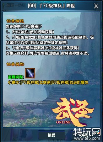 完成任务即获取一把60级神兵!所需要材料也都很容易获得,包括20个神铁和一把60级极品紫色武器,以及杀死2000个不低于自身等级10级的怪物(升到60级基本完成,可以组队)。而一些急性子的玩家,还可以通过交易购买材料,一升到60级就可以使用心仪已久的绝世神兵!