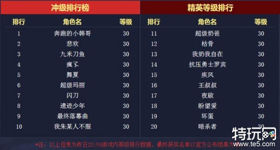 精英等级是玩家升到30级以后获得的等级,目前“瘋孓”、“闪刀”、“悲欢”暂居前三甲,势头正劲,排在后位的玩家也不要灰心,冲级赛后的“精英等级赛”才刚刚开始,所以排名暂居后位的玩家们可要卯足了劲向前冲啦。