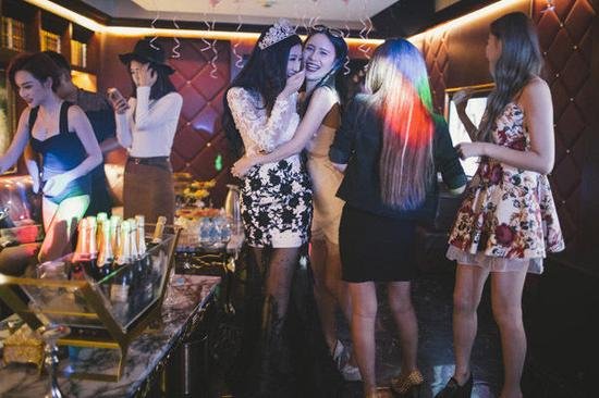 深夜十一点,张晓梵(中)与朋友在自己的生日聚会上。她拥有一个23万粉丝的微博,并以此推广自己。在首页的个人介绍里,她把描述自己是一名“ 95后混血模特”。