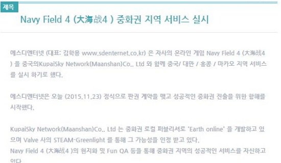 韩国游戏开发商SDEnterNET日前在其官网上公布一则消息,宣布旗下策略海战网游《Navy Field4 (大海战4)》与中国酷派天空(英文名:KupaiSky Network(Maanshan)Co。, Ltd)签订了中国大陆及港澳台地区的运营权。酷派天空正是此前被推到舆论风口浪尖上的《地球OL》开发商。