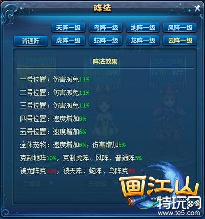 众所周知,八阵图是三国诸葛亮创设的一种阵法,阵法之中兼容天文地理,其中种种玄妙不可多得。《画江山》原有的天阵、地阵、鸟阵、龙阵、虎阵、蛇阵的基础之上又增加了风阵和云阵,让八阵齐聚。并且在此基础上增加了阵法克制效果,全面杜绝一阵打天下的状况,给玩家的战斗变化创造了更多的可能性。