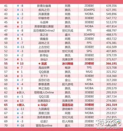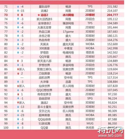 《战舰世界》上升47位,位列第32,势头强劲;有五个游戏新入榜单,且《怪物猎人OL》作为新入成员,排名62位,实力不容小觑。