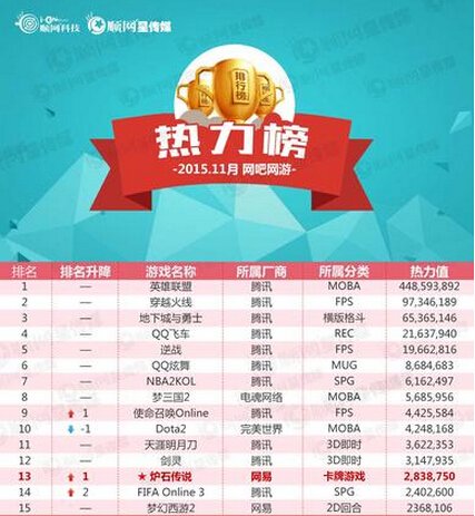 11月网吧榜:战舰世界强势上升 Dota下滑