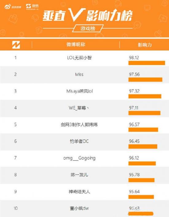 游戏大V影响力榜:小智力压Miss夺第一