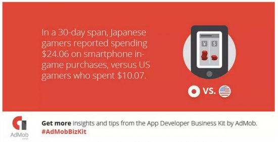 数据:在30天的时间段里,日本玩家的智能手机游戏内购支出达24.06美元(对于平板游戏,这一数字则是40.27美元),与此相比,美国玩家的支出只有10.07美元,中国玩家的支出只有7.81美元。