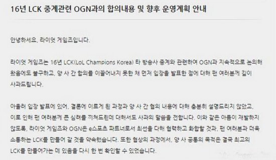 关于之前对2016年LCK转播权做出的公告,我们想继续和粉丝们致以最深的歉意。尽管我们当时已经和OGN进行了持续的讨论,但是公告发表时双方就此事并没有达成一致。