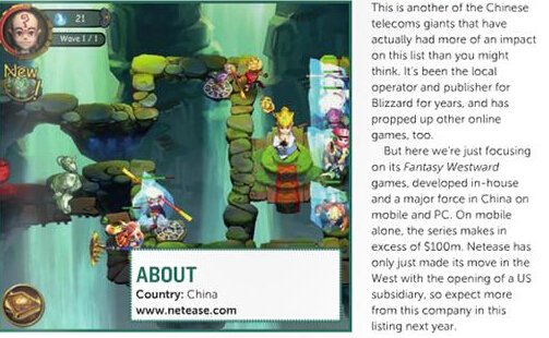 值得一提的是,网易作为中国优秀游戏开发商入选了这份名单。这份榜单的排名不仅仅以游戏收入为标准,还考虑到了公司的行业地位和游戏在玩家中的口碑,在国产游戏整体评价不高的情况下,网易游戏依然脱颖而出,品质和实力得到了国外媒体的认可。
