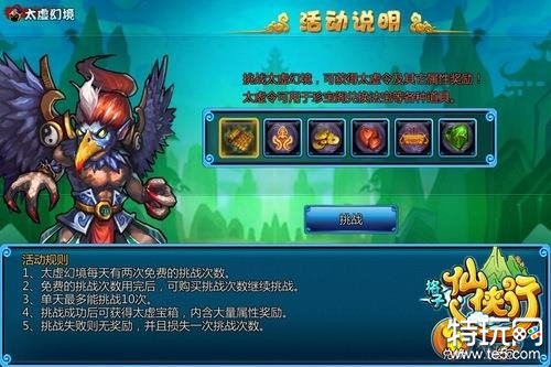 在公测推出的新内容之中,太虚幻境算是玩家最期待的内容了。在主城玉虚城的NPC“风师箕伯”处可以进入到太虚幻境之中。每一位玩家在每天都会得到由系统提供的两次免费挑战的次数,若是挑战成功的话玩家就可以得到太虚鼎作为奖励,打开太虚鼎之后玩家将有机会获得太虚令、金钱、潜能、信仰、器玉等奖励!关于太虚令很多玩家肯定都不了解是个什么用处,在这里我说明一下,玩家所获得的太虚令可以用来在太虚幻境中换取法宝等道具。若是玩家在一天之内想多次参加挑战的话,可以花费一定的元宝来购买挑战次数哟。