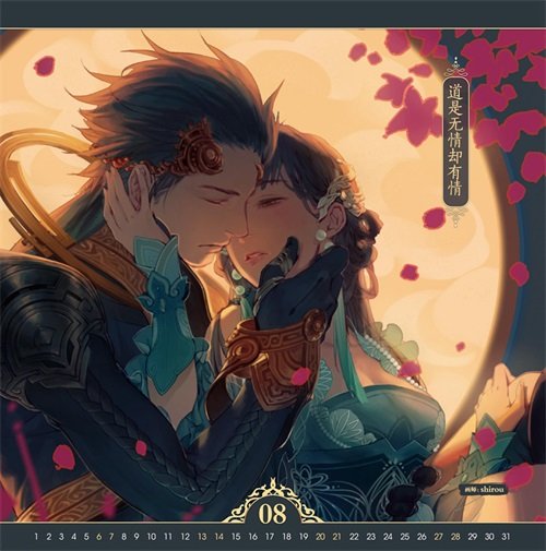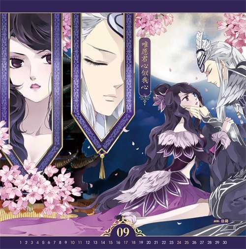 4月,出自插画家萧狱之笔,完美展现了男异人叶葬花家道突变的孤冷心性和女异人花渐隐的俏皮纯真!深色系的配色,与二人凄美的爱恋交相映衬!