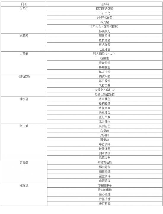 具体门派以及对应双倍奖励的日常活动列表如下: