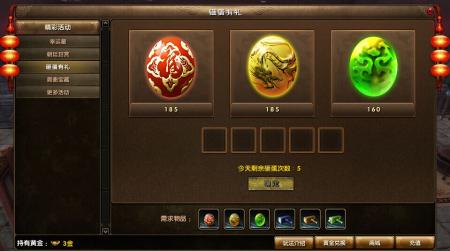 活动期间,翡翠蛋,金龙蛋,福气蛋 每种蛋上交10个给活动NPC(苏州阿仙儿),可以开启一次疯狂砸蛋模式,在规定的时间内达到任务所要求砸到的蛋的数量给予奖励,奖励为疯狂砸蛋奖励包