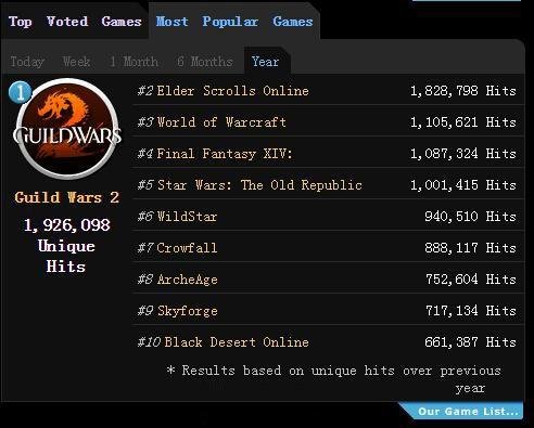 在这些MMORPG中,有的为老牌MMORPG,也有多款韩国制作的网络游戏,例如《上古世纪》、《黑色沙漠》、《狂野星球》等。其中,来自NCsoft北美工作室ArenaNet开发的《激战2》更是高居榜首。