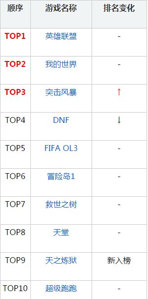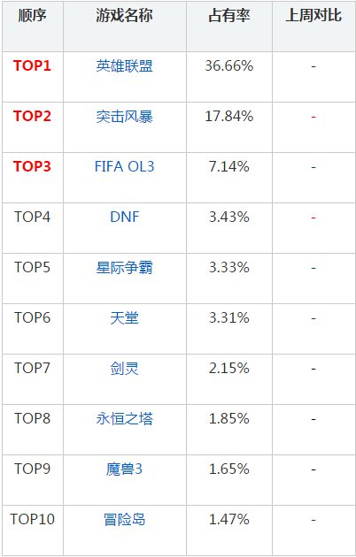 除了《突击风暴》外,其余游戏排名不变,但出现不同程度的占有率下滑,《剑灵》下降0.11%,《永恒之塔》下降0.09%,《冒险岛》下降0.04%。