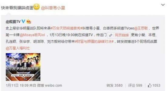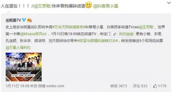 王思聪转发的微博是今晚在熊猫TV直播的#万合天团首秀#,从微博中不难看出,这个号称史上最豪华明星战队不仅有王思聪,还有叫兽易小星、白客、若风等等。