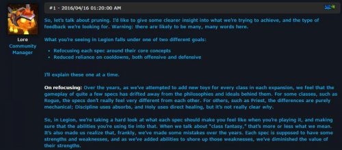 几年来,在每部资料片我们尝试为各个职业加入新内容的时候,我们认为很多职业专精的设计都已经背离了它们原有的观念和思路。对于某些职业,比如潜行者,三系专精之间并没有什么太大的不同;其他职业,比如牧师,不同之处仅仅在于相关机制不一样:戒律牧就是吸收伤害,神牧就是直接治疗,但并不清楚为何这样设计。