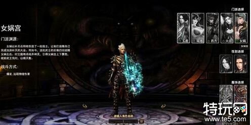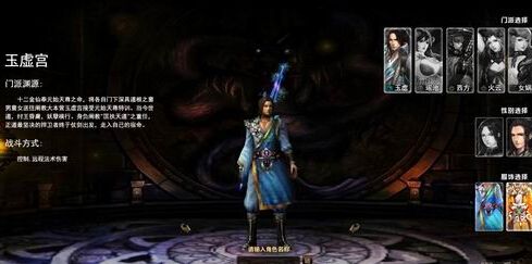 进入游戏首先创建角色,《创世神话》共有五个职业供玩家选择:玉虚宫、瑶池殿、西方教、火云洞、女娲宫。玩家只要选择好职业后输入名称就可以完成创建了。游戏中的人物虽然没法自定义但是每个门派有两套服饰供玩家选择。