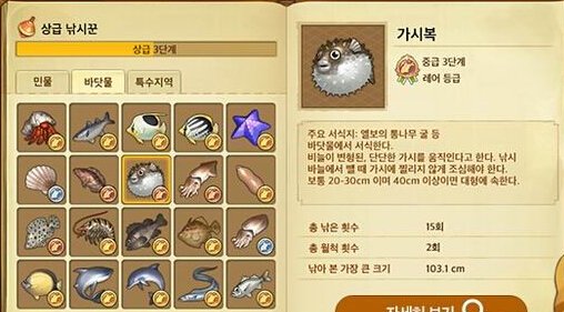 在钓鱼的玩法中,所有有水的地方-包括污水、岩浆、河边、大海等等,都可以进行垂钓。不同的垂钓点有熟练度的限制,并且鱼也有不同的尺寸,在鱼类图鉴中可以进行查看。
