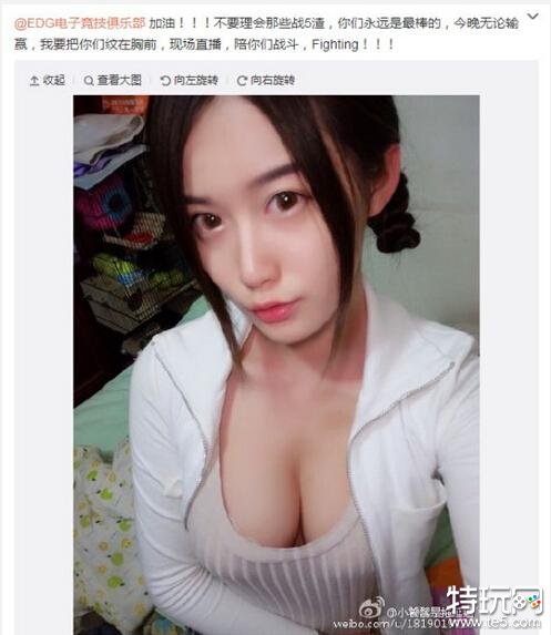 今天下午14时许,国内某游戏平台女主播微博发文“@EDG电子竞技俱乐部 加油!!!不要理会那些战5渣,你们永远是最棒的,今晚无论输赢,我要把你们纹在胸前,现场直播,陪你们战斗,Fighting!!!”此条微博一出,迅速火爆整个微博圈。