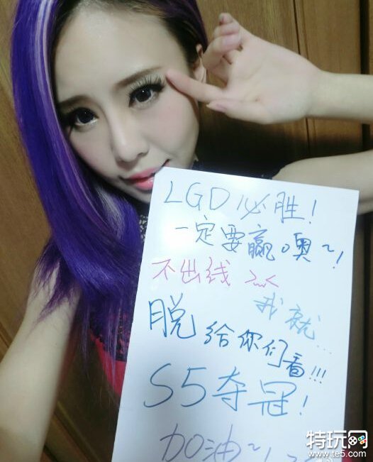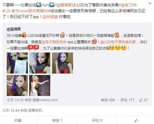 而LGD战队在国内人气一直很高,支持他们的粉丝并没有对于战队放弃希望。一位叫做@御澪爱的Coser便发布了一条微博,表示了对于LGD战斗的支持,并且宣称如果LGD未能在S5小组赛之中突围,她便愿意在电子竞技app上直播“脱衣”。