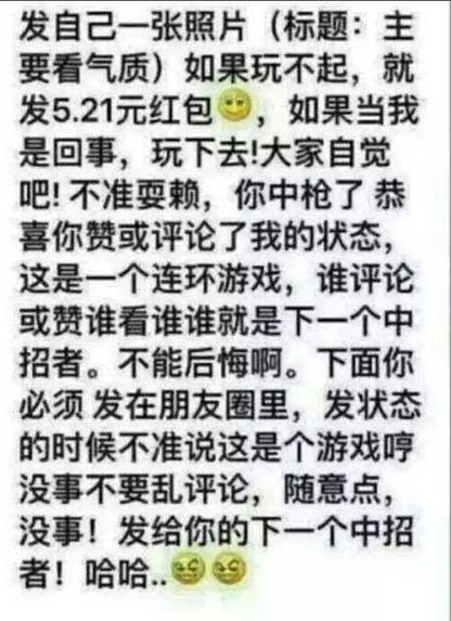 这两日,“主要看气质”的文本配上自拍照片或者是自己的宠物照火遍网络,连明星们都火热参与。追根究底,这就是一款接力游戏:当事人在朋友圈发出“主要是气质”,配上图片后,只要有好友点赞或者评论,就要接受“惩罚”,要么发红包,要么自拍接力。