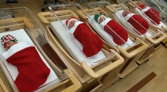 新出生的宝宝都裹在圣诞袜里: