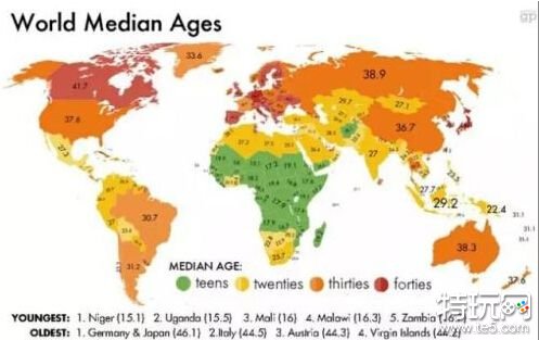 世界各国的国民平均年龄。绿色是10~20岁,黄色是20~30岁,橙色是30~40岁,红色是30~40岁。