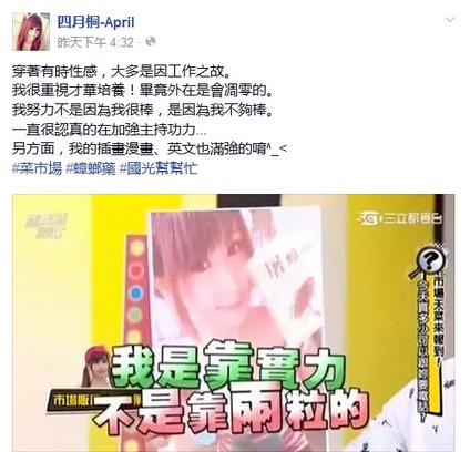 还是先由软妹君介绍下事情的经过吧,“四月桐”是台湾知名coser与游戏showgirl,经常在游戏或展会中担任主持或出cos作品,最近呢,她在脸书上晒出了几张最新的美照,并PO文表示:穿着有时性感,大多是因工作之故。我很重视才华培养!毕竟外在是会凋零的。我努力不是因为我很棒,是因为我不够棒。一直很认真的在加强主持功力……另方面,我的插画漫画、英文也满强的唷。